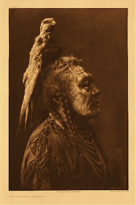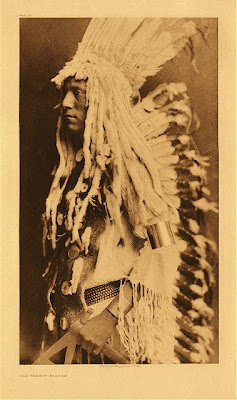 Guerrero de la tribu de los Piegan con la pipa medicina o de la paz. 1910.Curtis trabajó más de 30 años en su intento de documentar la vida, costumbres, mitos, hábitos, religión, lengua y más, de decenas de tribus americanas. Su respeto por las mismas, fue una de las razones por la que lentamente fue ganando la confianza de los "indios". Paulatinamente fue siendo aceptado como uno más .